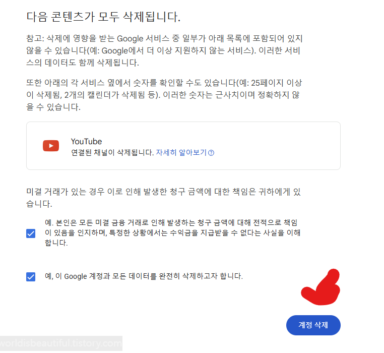 6. 체크를 하고 계정 삭제를 누르면 유튜브 계정을 삭제할 수 있습니다.