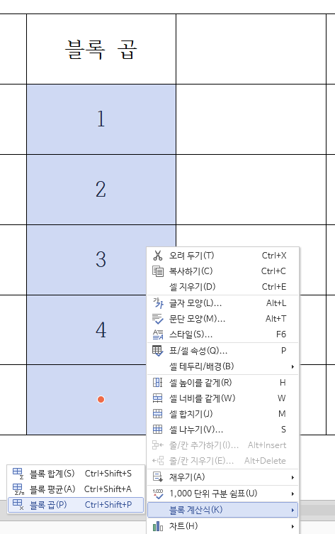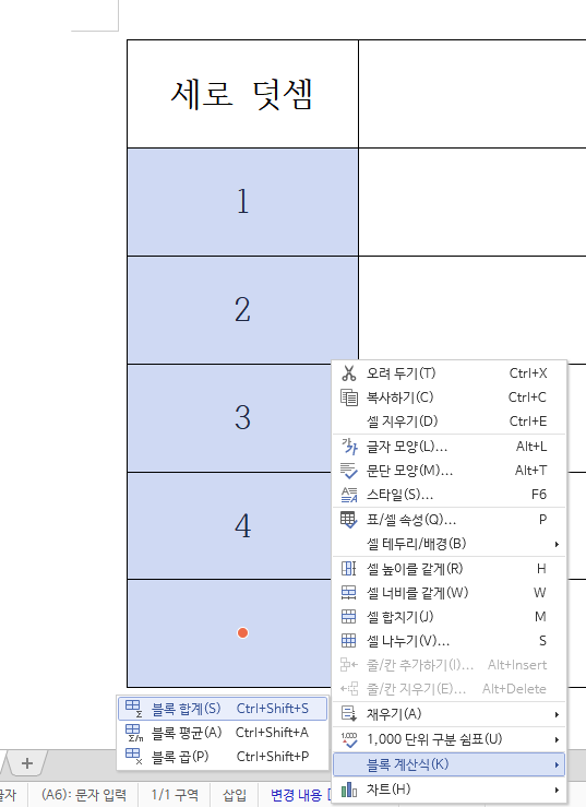 2。세로로 표들을 선택한후 블록 계산식 - 블록 합계를 누르면 결과를 볼 수 있습니다。